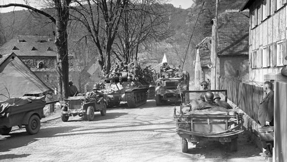 連合軍がドイツに侵攻する中、米第7軍第3歩兵師団の戦車駆逐車が、1945年3月23日、ドイツのバート・デュルケヒム-ルートヴィヒスハーフェン高速道路を前進している。(写真提供:国立公文書館) |