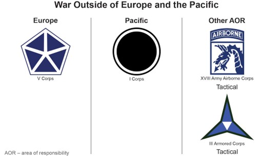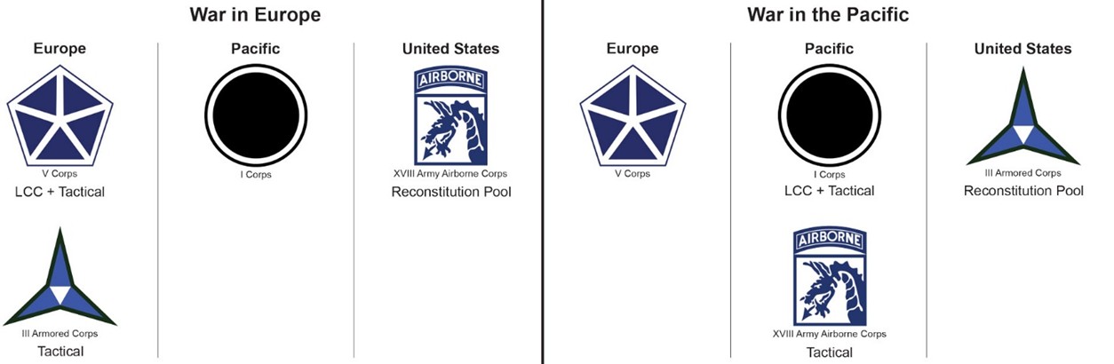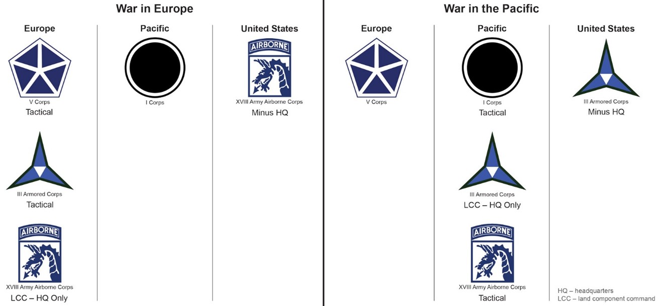 [16] ヨーロッパでは第5軍団、インド太平洋では第1軍団、そして紛争では第18軍団と第3軍団が戦術軍団である。