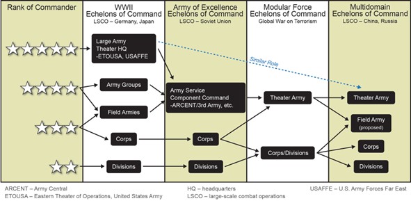 米陸軍には、大規模戦闘作戦中に陸上構成部隊コマンド(land component command)として複数の軍団を指揮・統制するための専用の編成がない。2022年、米陸軍はフィールド・マニュアル3-0「作戦(Operations)」の発行により、マルチドメイン作戦を作戦コンセプトとして採用した。マルチドメイン作戦は軍団と師団を統合解除し、階層間の強い相互依存関係を生み出す階層化陸軍のコンセプトも再導入した[9]。特に、下位階層は、成功の条件を整えるために重要な能力を活用するために上位階層に依存している[10]。これは、効果的な上位階層は、多数の調整および同期タスクから下位階層を解放することにより、よりスリムで致命的な下位階層を可能にすることを意味している。ただし、これはまた、上位階層での課題が下位階層に波及するにつれて複合的な影響を及ぼすことも意味する。
