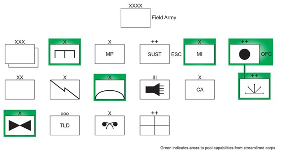 野戦軍は、その組織的戦力構造として司令部と司令部大隊のみを有するべきである。司令部が提案の中核を成し、司令部大隊は司令部と全ての有機的な指揮所の要素組織に管理・兵站支援を提供する。私の提案では、紛争に投入される軍団が野戦軍に配属される。例えば、ヨーロッパ紛争において、提案された野戦軍はヨーロッパ軍の責任地域に展開し、統合部隊司令官に配属され、その後、第5軍団と第3軍団が配属される。このモジュール方式は、第二次世界大戦間の陸軍地上軍が軍団と軍に用いたものと同じであり、柔軟な運用と、動的な要件に合わせてタスク編成を迅速に変更する能力を可能にする[62]。
