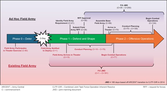 最後の選択肢は、紛争中に臨時の野戦軍を編成することである。しかし、紛争中に野戦軍司令部を編成しても、必要になった時に間に合わないため、効果的ではない(図7参照)。第二次世界大戦中、野戦軍が編成されてから計画と準備を開始するまでには1~3ヶ月を要した[56]。当時の計画と準備期間は平均3~5ヶ月であった[57]。つまり、歴史的に見て、完全に機能する野戦軍を編成するには4~8ヶ月かかるということであり、統合部隊司令官にとって陸軍が完全に準備完了するまで待つには長い時間となる。