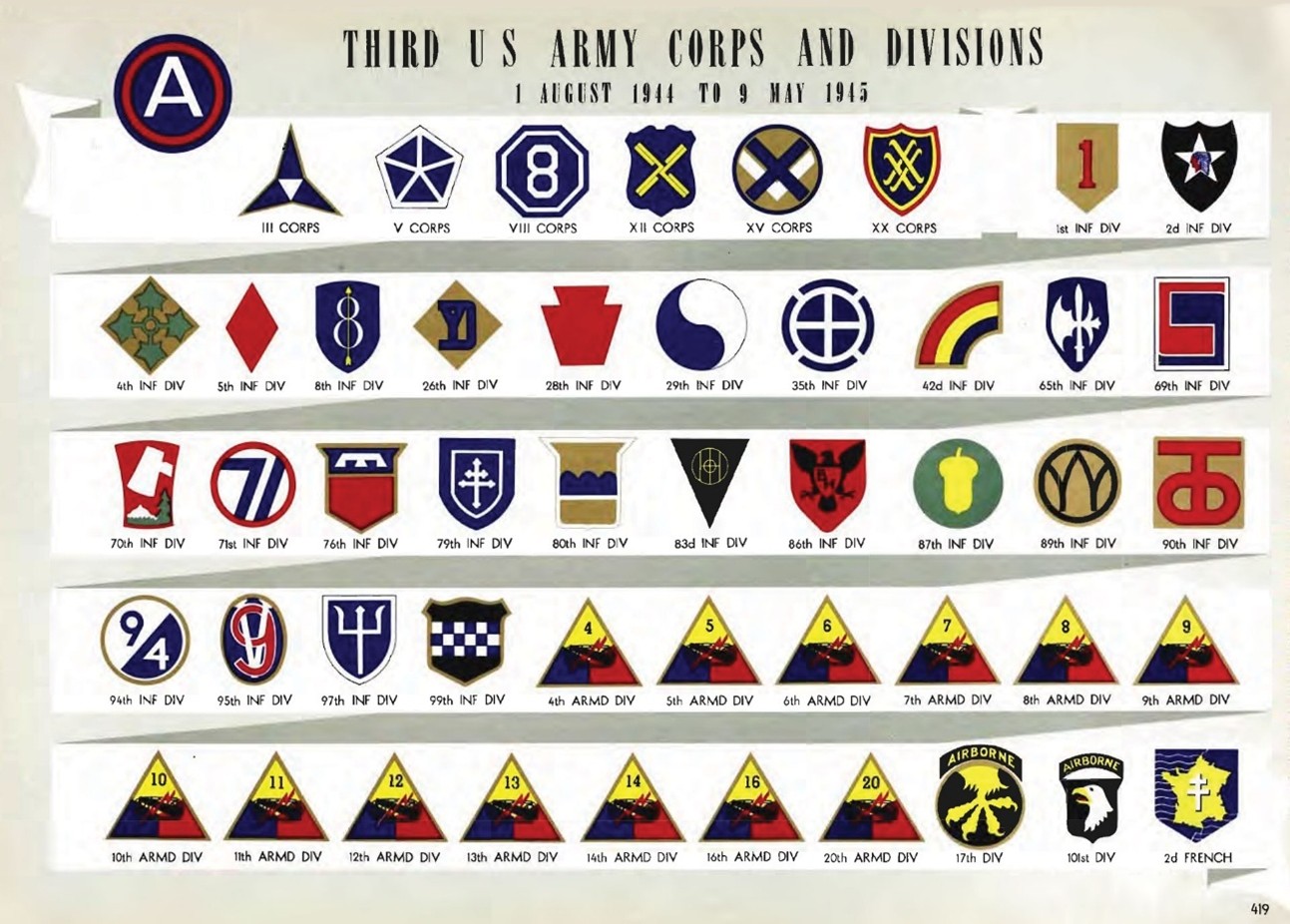 1944年8月から1945年5月にかけてのヨーロッパ作戦において、米第3軍に配属されたすべての軍団と師団(ただし、すべてが同時に配属されたわけではない)。現在の陸軍の戦力構成では、大規模な戦闘作戦において同様の戦力構成を指揮・統制するには、戦域軍または軍団のいずれかが必要となる。(写真は米第3軍「作戦報告書」(1944年8月1日~1945年5月9日)第1巻「作戦」(1945年)419ページより) |
