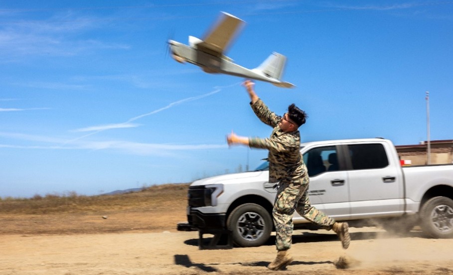 カリフォルニア州ペンドルトン海兵隊基地で、第1海兵師団第5海兵連隊第3大隊のインテリジェンス専門家であるエリック・グラナドス(Eric Granados)海兵隊伍長が、小型無人航空機システム訓練の一環として、人工知能搭載システム「デッド・センター」でRQ-20プーマを発進させる様子。 2025年8月20日(米海兵隊/トレント・A・ヘンリー(Trent A. Henry)撮影)。 |