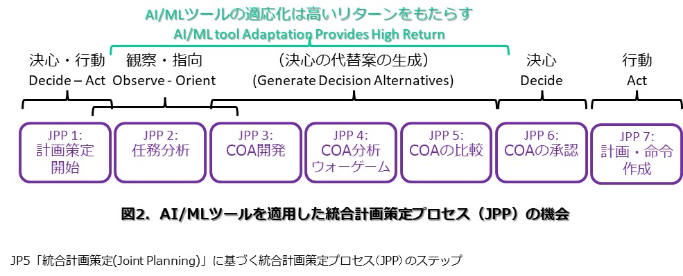 意思決定は複雑ではあるものの、リンクされた情報フローのサイクルである[36]。ジョン・ボイド(John Boyd)のOODAループ(観察、指向、決心、行動)は、このプロセスを簡略化するのに役に立つ。空中戦のニーズから生まれたOODAループは、敵がこのループを巡る速度よりも速く循環することで、戦闘において優位性を生み出すと主張している。コンセプト的には、ボイド(Boyd)の考えは、認知戦におけるAI/MLツールの活用に説得力がある。観察と方向づけのステップでは、行動主体は情報を収集・認識し、環境、脅威、機会、リスクに関するメンタル・モデルを構築する。暗黙のステップとして、決心の代替案(decision alternatives)を生成し、それらの代替案を比較検討した上で、1つを選択し(決定ステップ)、実行する(行動ステップ)[37]。この簡略化されたフレームワークを踏まえると、AI/MLツールは、観察・方向づけプロセスや決心の代替案(decision alternatives)の生成と比較に非常に適している。統合計画策定プロセス(JPP)を代表的な軍事意思決定プロセスとして用いることで、これらの可能性が浮き彫りになる(図2参照)。
