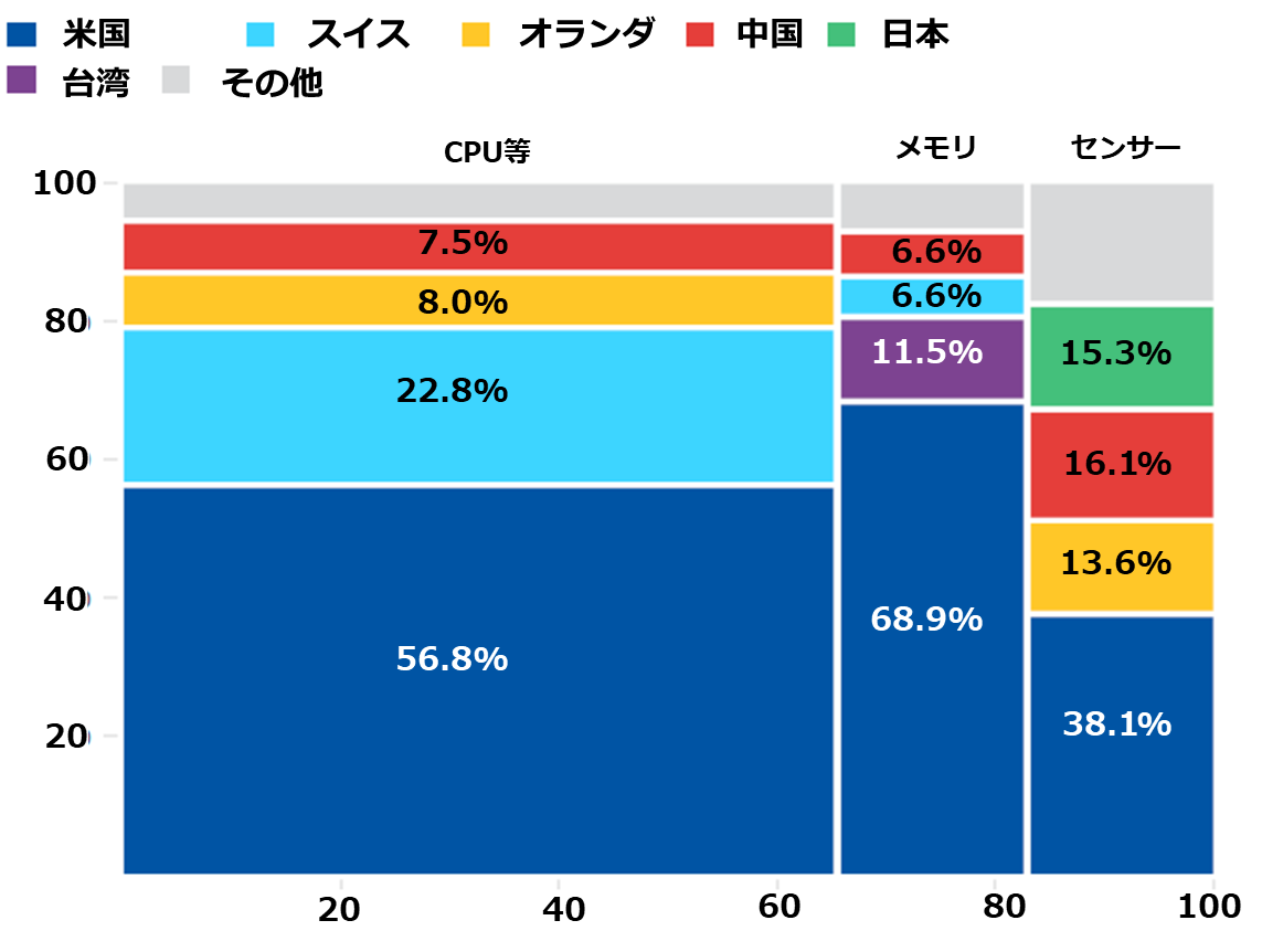 図6に示すように、米国に本社を置く企業は、3つの機能カテゴリーすべてで識別されたAI関連コンポーネントの最大の割合を占めている。掲載されている国は、製造者本社の所在地を反映している。米国のリードは特にメモリ・ハードウェアで顕著で、回収されたユニットの約69%が米国企業が生産し、同国のプロセッサも依然としてかなりの割合を占めており、特定されたコンピューティング部品の約57%未満を占めている。センサーのサプライ・チェーンは地理的に多様化しているが、アメリカが約38%で最大の原産国を占め、中国が約16%、日本が15%強である。